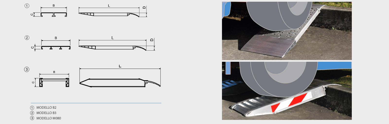 | model | Cod articol | Sarcină maximă de încărcare în kg | Lungime L mm | Lățime exterioară B mm | Înălțimea Riser C mm | Dimensiuni generale rampa în înălțime D mm | Diferența de înălțime min / max mm | Greutate pe pereche kg |